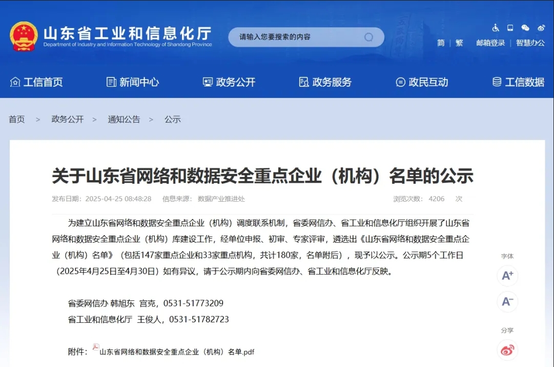 近日,在省委網信辦、省工業和信息化廳聯合開展的山東省網絡和數據安全重點企業(機構)庫建設工